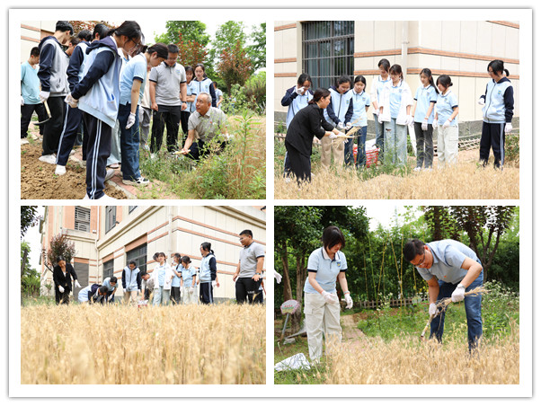 5月14日,高二年级学子和第二党支部党员同志在校长梁昌波的带领下,前往耕读基地开展小麦收割活动。金黄的麦穗在手中化作美丽花环与麦束,同学们将其送到高三学长学姐手中,寓意着对他们高考的美好祝福。