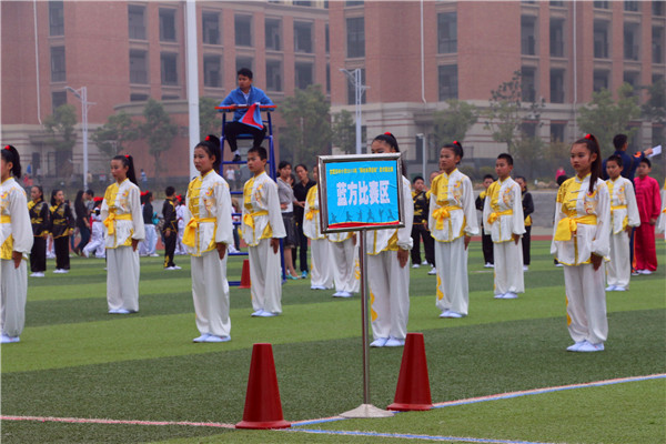 10月25日,深秋时节的合肥七中绿茵场上,天高云淡,红旗漫卷,阵阵金风夹裹着丝丝寒意,但一场激情澎湃的武术操比赛在这里如火如荼的进行着,为水木明瑟的七中校园带来青春的气息。本次武术操比赛是合肥市中小学2015年“阳光体育运动”的项目之一,由合肥市教育局和合肥市体育局主办,合肥市武术运动协会与合肥市第七中学共同承办。