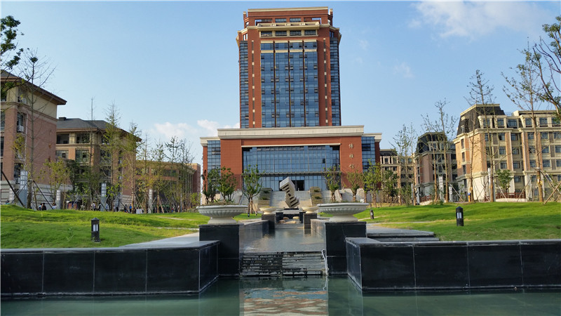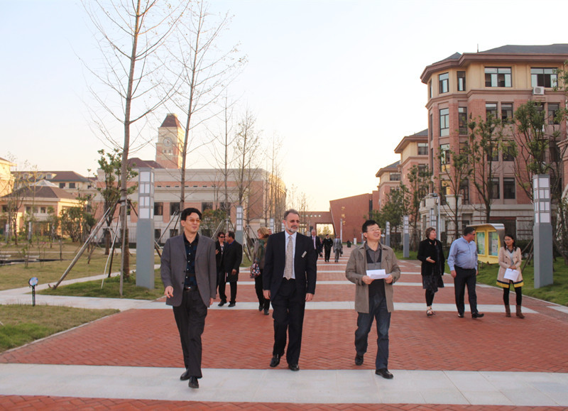 杨校长说,图书馆前主题雕塑“书山”。中国有句名言“书山有路勤为径,学海无涯苦作舟”,激励同学们以勤奋为伴,以苦难为侣,攀登知识的高峰。中心广场是借鉴了美国马里兰大学的广场风格,生态园借鉴了苏州园林的特色。生态园池塘里的水我们称为“东方之水”,中心广场里的水代表的是“西方之水”。东方的水和西方的水以一桥贯通,象征着西方和东方的融合。