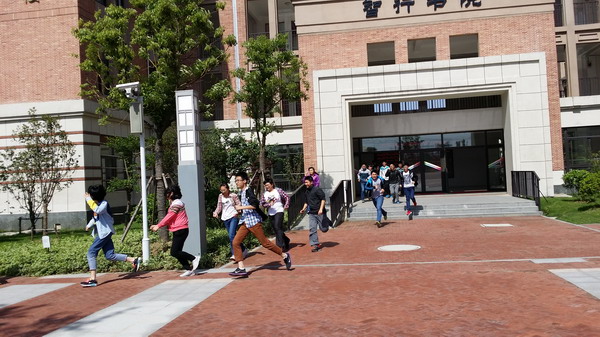 当广播中响起警报时,全体人员严格按照突发事件应急预案,进入各自岗位,各班学生在老师指挥下按照指定的安全出口,有序地离开教室,及时疏散,撤离到安全地带。整个过程紧张而有序,两个校区近3000名学生和老师全部安全、迅速地到达集合地点,收到了预期效果。