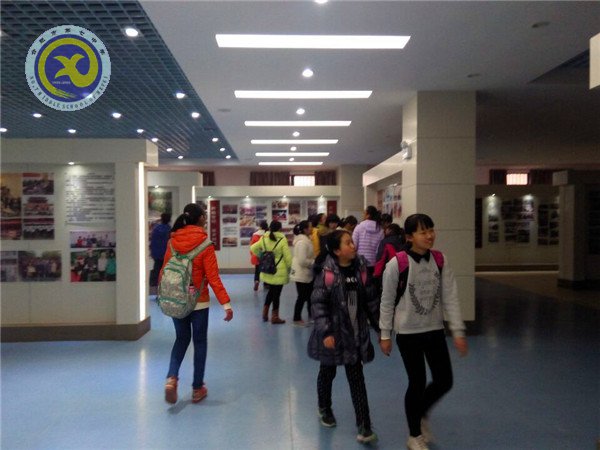 中午11:20,两辆大巴车相继驶入七中,当孩子们沿途看到七中内部的景色后发出阵阵惊叹和赞扬:“七中好漂亮!”“还有小池塘和走廊!”“七中的房子建得好美!”带着激动的心情孩子们从车上下来,边走边拍照。七中老师带领学生们到食堂“禾香园”四楼吃了学生餐。吃完饭后孩子们分成两组,每组安排两名中层领导和一名老师,带领同学们参观学校的各教学楼、礼堂 “桃蹊会堂”、实验楼“格致院”、综合楼“鸿采馆”、图书馆“博雅馆”、体育馆“行健馆”以及学生宿舍等各个场馆。