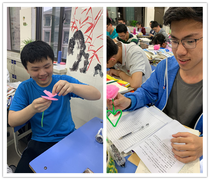 为表心意,一呼百应,全班五十位同学亲自动手,以纸为瓣,玄铁为枝,将满怀爱意折进每片花瓣,经半小时的努力,终于为母亲做出一朵朵鲜妍美丽的康乃馨,如同亲子间细水长流的脉脉温情,永不凋败,永不干涸,随笔墨一同流淌到母亲面前。