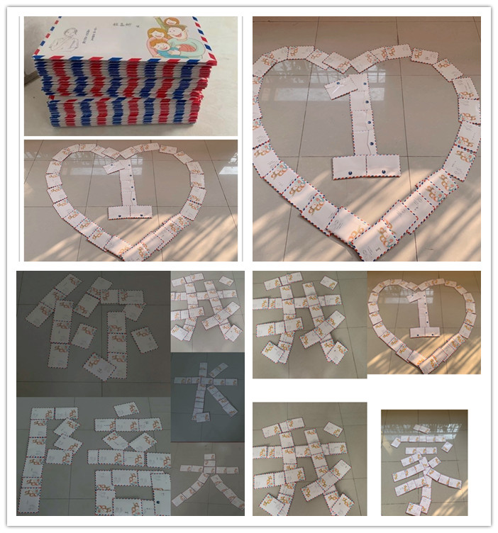 最后,我们全班同学用家书一起摆出“我爱我家”“你陪我长大,我陪你到老”的字样和爱心的图案。爱心的中间是高一(1)班的“1”字,也代表着我们对班级的热爱。每一个字都由五十五封家书组成,每一封家书上都印有老师和同学们一起设计的图案,凝聚着班集体的力量,更是增添了许多暖意。“烽火连三月,家书抵万金。”在多年后的今天,我们虽然身处和平时代,但浓浓的亲情却丝毫未减。“你陪我长大,我陪你到老”这里的每一个字也都不是空话,未来的日子里,我们也会学着理解父母,品读父母的爱。